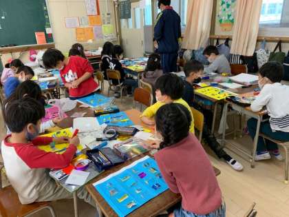 12月8日(火)2時間目、2年2組は図工で、カッターナイフで開けた窓の中に絵をかいていました。ある男の子に、何の絵を描いているのかをきくと、「うらしまたろう」という答えでした。一人一人工夫して絵を描いていました。