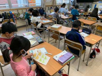 12月9日(水)1時間目、2年1組は算数で、子どもたちは三角形と四角形を切り抜いていました。先生は切り抜きに時間がかかり、2時間かけて学習をすすめていくとおっしゃっていました。