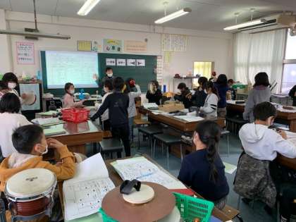 12月9日(水)2時間目、4年2組は班ごとに音楽を作っていました。小だいこ、ボンゴ、コンガ、マラカスなども使ってリズムや音の大きさを考え組み合わせて演奏していました。