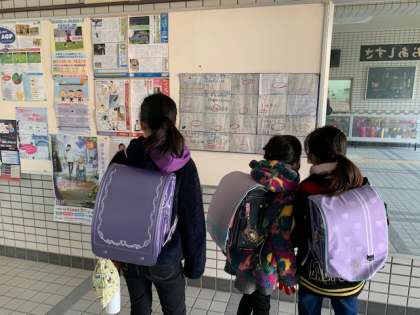 12月10日(木)先週の土曜授業で行われたたてわりクイズラリーの答が玄関に掲示されています。登校した子どもが見ていました。また閉会式を代表委員会の子どもたちが職員室から放送で行い、順位の発表がありました。