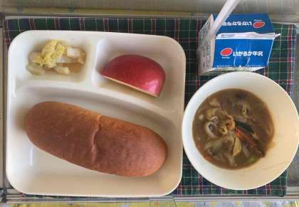 【カレーうどん、はくさいのおひたし、りんご、黒糖パン、牛乳】