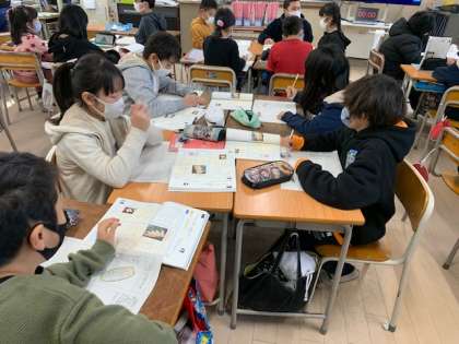12月11日(金)1時間目、4年2組は国語で「『ふるさとの食』をつたえよう」の学習をしていました。教科書を参考にして、大阪じまんのおいしい味「大阪のたこやき」についてプリントにまとめていました。グループで話し合いも行うようです。
