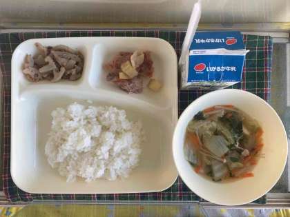 【豚肉のねぎじょうゆ焼き、すまし汁、れんこんのおかかいため、ごはん、牛乳】