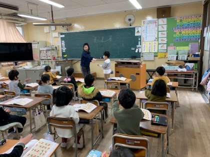 12月14日(月)4時間目、1年1組は音楽で「おちゃらか ほい」をしていました。手遊びのしかたを見本を見てこれから練習するところです。