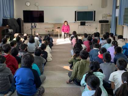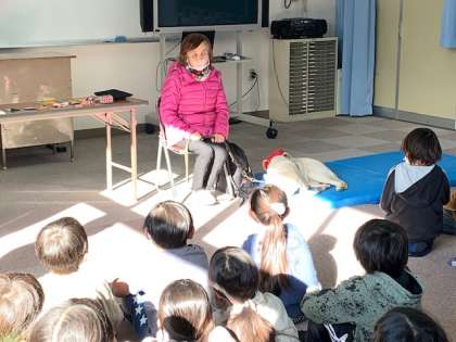 12月15日(火)2時間目、3年生はふれあいルームで、盲導犬の学習をしました。ゲストティーチャーとして山本さんがフェリシアという盲導犬を連れて来てくださいました。盲導犬についてのお話をたくさんしてくださいました。それ以上に山本さんの生き方にふれることができたと思います。ご自身が子どものために料理を習おうと思ったことがきっかけで、家に閉じこもりがちだったのが、外に出るようになり盲導犬と出会ったこと。ご自身の体験をもとに「人ってこころがけ一つで変わる。」「やればできるという気持ちでチャレンジしてほしい。」とおっしゃっていました。子どもたちにとって貴重な出会いになったと思います。
