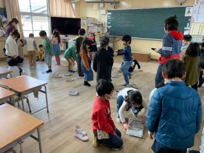 12月23日(水)2時間目、1年1組は学級活動をしていました。新聞紙を折って、その上に子どもたちが片足でのって楽しそうにしていました。黒板には「ごろぴかどん」「しりとり」「ばくだんゲーム」「しんぶんおりゲーム」と書かれていましたので、みんなでお楽しみ会をしていたのだと思います。
