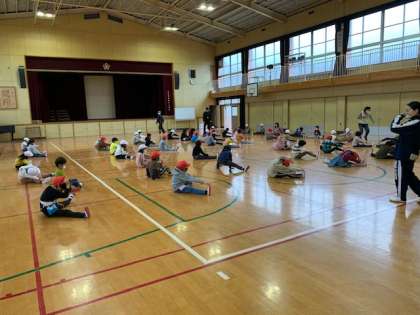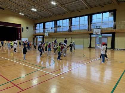 1月7日(木)3時間目、1年生は体育館で体育のように並んでラジオ体操と柔軟体操をしていました。よく見ると体操服ではありません。そのうち、全員でドッジボールが始まりました。