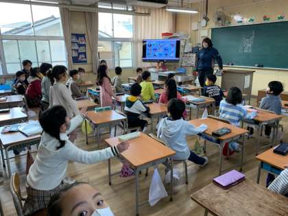 1月13日(水)朝の英語タイムで1年2組は「Seven steps」をしていました。歌に合わせて、自分の数字で立つと言うゲームです。子どもたちは英語の数字をよく聞き分けていました。1組では、モニターに映された絵を見て英語で言う練習をしていました。