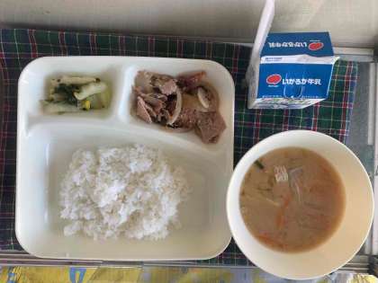 【豚肉のごまだれ焼き、みそ汁、きくなとはくさいのおひたし、ごはん、牛乳】