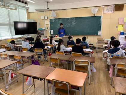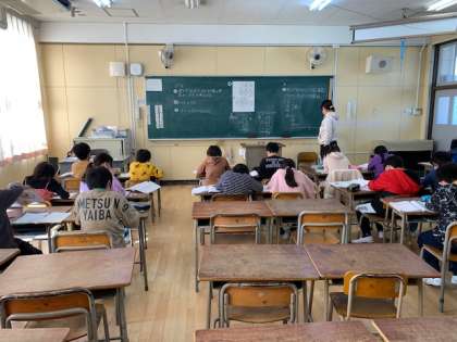 1月19日(火)2時間目、3年2組は算数で少人数に分かれて学習していました。「答えが4けたになるかけ算の筆算のしかたを考えよう」というめあてで学習していました。