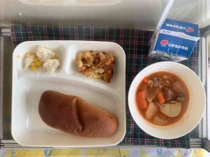 【豚肉と野菜のケチャップ煮、カリフラワーのピクルス、桃のクラフティ、黒糖パン、牛乳】