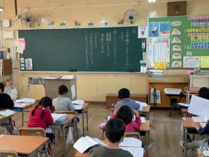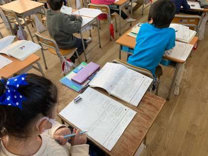 1月25日(月)5時間目、1年2組は国語の「小学校のことをしょうかいしよう」で、したことをメモに書いていました。季節ごとにしたことや感じたことをプリントに書いていました。