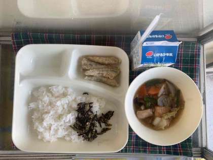 【いわしてんぷら、あつあげと野菜の煮もの、ごまひじき、ごはん、牛乳】