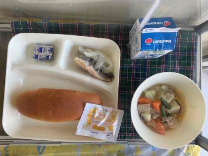 【あじのレモンマリネ、てぼ豆のスープ煮、固形チーズ、コッペパン、マーマレード、牛乳】