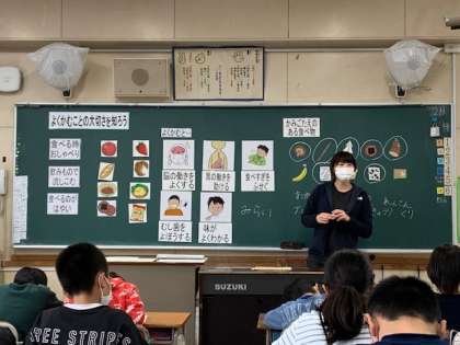 2月1日(月)5時間目、4年1組で栄養指導が行われました。「よくかむことの大切さを知ろう」というめあてで学習しました。自分は固い物を食べるのを好むのか柔らかい物を食べるのを好むのかの傾向を知った上で、よくかむことのよい点や、かみごたえのある食べ物について学んでいきました。