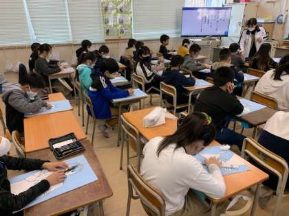 2月10日(水)1時間目、4ねん1組は図工で版画をしていました。先生と鼻のあたりの彫り方を確認し、掘り進めていました。