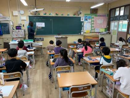 2月12日(金)1時間目、1年2組は算数で問題を図に描いて考えていました。椅子の数の問題ですので、ノートに椅子の絵をかいて考えている子もいました。