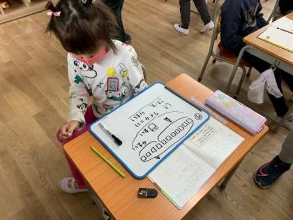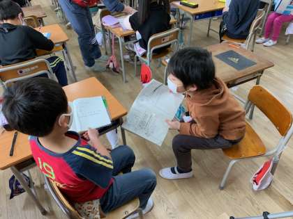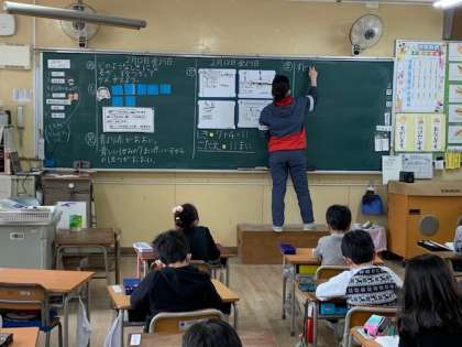 2月12日(金)2時間目、1年1組は算数で問題を図に表して考えていました。いろいろな考え方が出てきました。隣の人に説明したり、大きな声で発表したりできました。