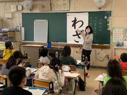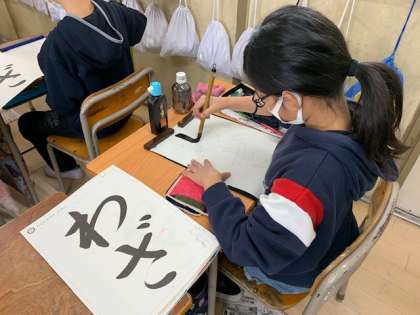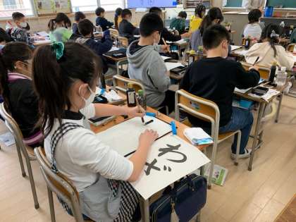 2月12日(金)5時間目、4年1組は書写で「折れ・折り返し」の学習をしました。書く字はひらがなで「わざ」でした。