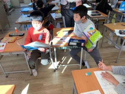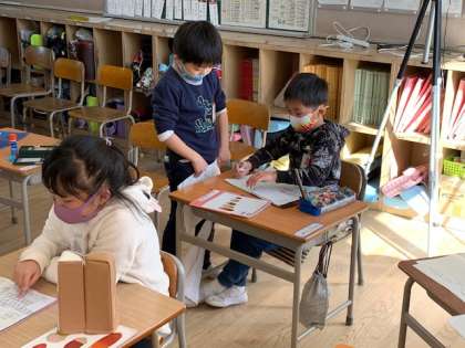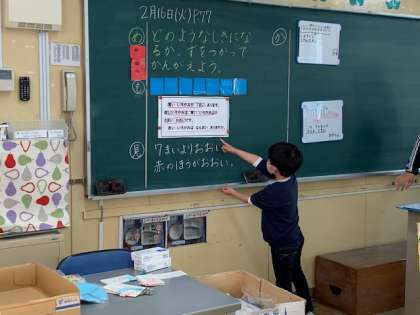 2月16日(火)5時間目、1年2組は算数で「ずをつかって かんがえよう」の学習をしてました。一人一人がノートに考え方を図に表し、近くの子と交流した後、発表しました。図に表し数や言葉を書き込むとわかりやすくなることがわかりました。
