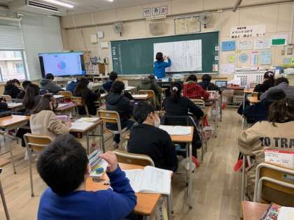 2月19日(金)1時間目、5年1組は国語でした。モニターに大きな円グラフが映し出されていたので算数かと思いました。授業をよく見ると「資料を見て考えたことを話そう」という学習でした。円グラフからわかることを読み取り、伝えるという学習のようです。