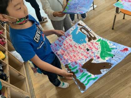 2月20日(土)1時間目、1年1組はスイミーの絵の仕上げをしていたようです。できた絵を見せてくれました。