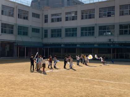 2月20日(土)2時間目、1年1組は生活科でたこあげをしていました。お天気は良いのですが風があまり吹いていません。たこを高くあげることができたでしょうか。