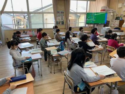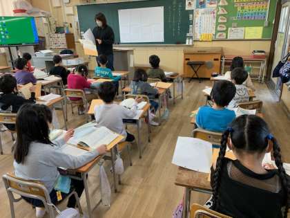 2月22日(月)1時間目、1年2組は国語で、「一年間をふりかえろう」の学習をしていました。作文の学習のようです。一年間のできごとをふりかえるために、生活科のファイル等を見ていました。