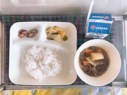 【肉じゃが、はくさいのゆず風味、とら豆の煮もの、ごはん、牛乳】
