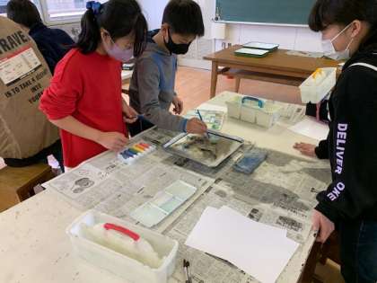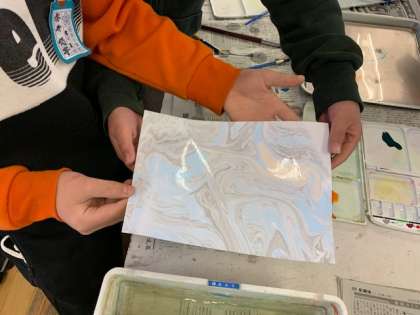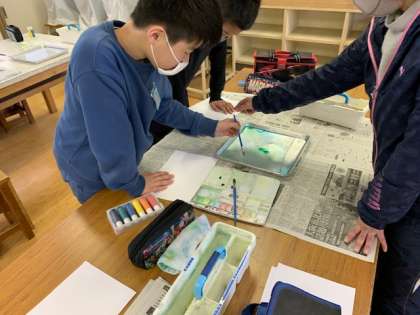 3月2日(火)5時間目、5年1組は図工でマーブリングをしていました。教頭先生にやり方を教えてもらい、班ごとにチャレンジしていました。初めは慎重だった子どもたちがだんだん大胆になっていくような気がしました。