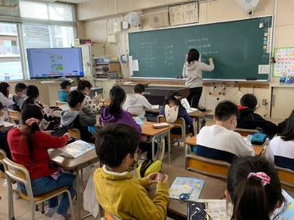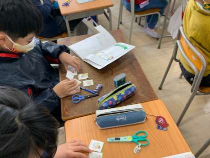 3月3日(水)1時間目、4年1組は外国語活動で「This is my day.」という学習をしていました。子どもたちは、活動のカードをはさみで切って準備をしていました。