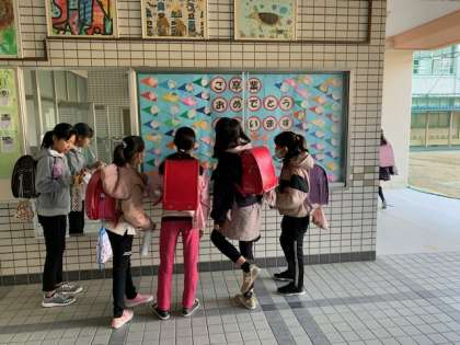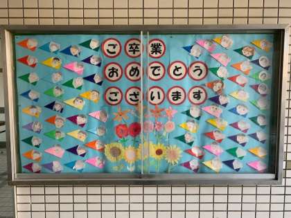 3月4日(木)玄関掲示が「卒業おめでとう」バージョンに変わっていました。6年生自身がかいた似顔絵に4年生が飾りをつけ仕上げたようです。6年生の子どもたちが見ていました。