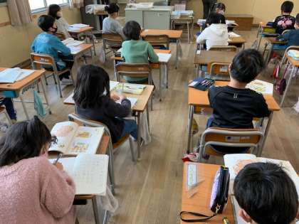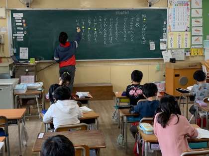3月4日(木)1時間目、1年1組は国語で「ことばの ひろば」を学習していました。「げんかん〇入る。」「げんかん〇出る。」の〇に入る言葉を考える学習です。ろうか、ドア、いすと考える対象が広がっていきます。