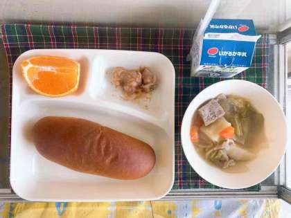 【鶏肉のみそバターソース、スープ煮、デコポン、黒糖パン、牛乳】