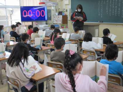 1年2組は、1時間目に国語「花さかじいさん」を音読していました。