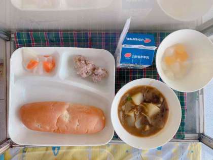 【フライドチキン、カレーシチュー(近江牛)、おいわいピクルス、フルーツゼリー、おさつパン、牛乳】