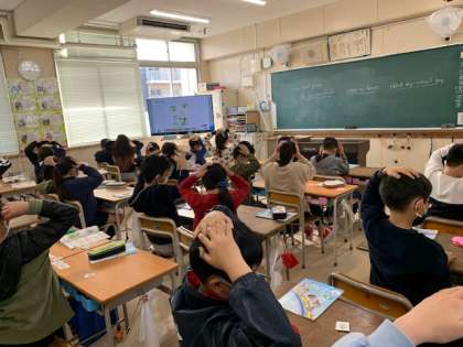 3月10日(水)1時間目、4年1組は外国語活動をしていました。全員頭に手を置いていたので、何かなと思いました。先生が英語を言うと、手をおろして、カードの取り合いをしていました。ゲームで学習すていたのですね。
