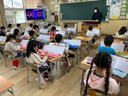 3月16日(火)5時間目、1年2組の教室からシャレた曲が聞こえてきます。のぞいてみますと「聖者の行進」を鍵盤ハーモニカで演奏していました。