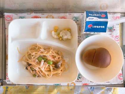 【さけのクリームスパゲッティ、カリフラワーとコーンのサラダ、黒糖パン(1/2)、牛乳】