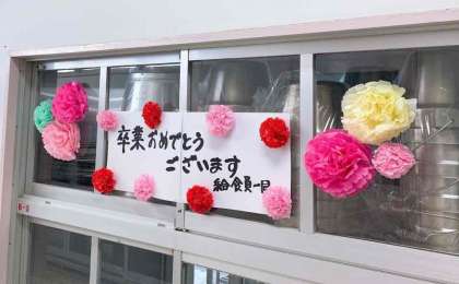 調理員さんが綺麗に給食室の飾り付けをして、卒業をお祝いしました。