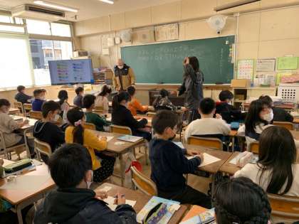 3月23日(火)1時間目、4年1組は外国語活動でアルファベットをマス目に書いてアルファベット・ビンゴをしていました。