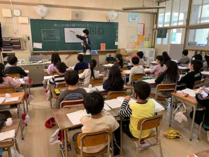 3月23日(火)2時間目、2年2組は国語で漢字の点や画について学習していました。水筆で書く練習をして、点や画を体で感じるとともに、3年生で学習する書写に向けての助走の意味もあるようです。大きな水書版を黒板に貼り付けると、子どもたちから、「わー。」と歓声があがりました。