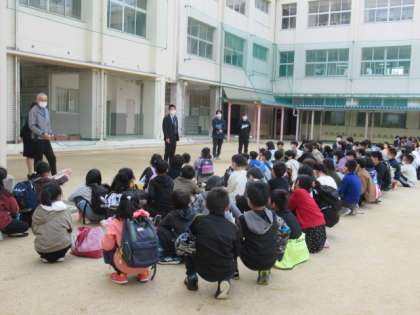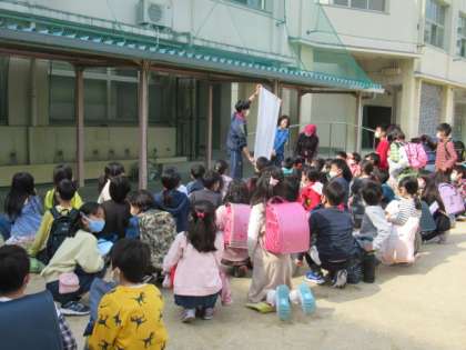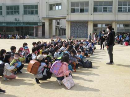 始業式の後、運動場で組分けが行われました。どの子も目をキラキラさせて先生の話を聞いていました。