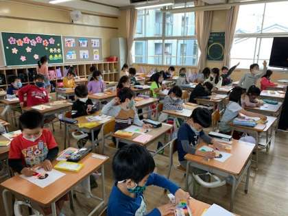 4月14日(水)1時間目、1年1組は図工でクレパスで自分の顔を描いていました。