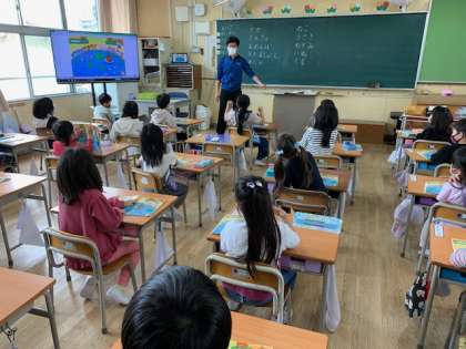 4月14日(水)3時間目、1年2組は算数で数の学習をしていました。はじめは、動物が出てきてお話を作っているのかなと思いました。しかしよく見ると教科書に出てきた動物の数を数えていました。