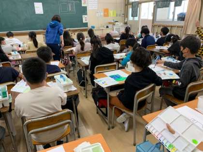 4月14日(水)3時間目、4年1組は図工で、「長靴」に絵の具で色を塗っていました。絵の具を塗る練習をしているのだと思い、子どもに聞きますと「ちがう。」という答えが返ってきました。この長靴を使って何かを完成させるのかもしれません。出来上がりが楽しみですね。