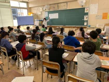 4月15日(木)1時間目、4年1組は算数で数直線を使って学習していました。1めもりが億の単位の数直線でした。
