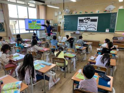 4月20日(火)1時間目、1年2組は算数で「たねまき」を学習していました。数を数えたり、どちらがどれだけ多いか比べたりしていました。