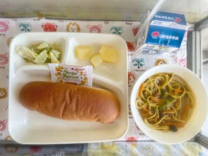 【コッペパン、牛乳、カレースープスパゲッティ、キャベツのピクルス、りんご(缶)、アプリコットジャム】