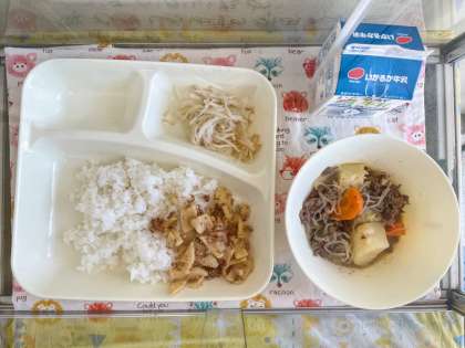 【ごはん、牛乳、肉じゃが、もやしのゆずの香あえ、ごまかかいため】